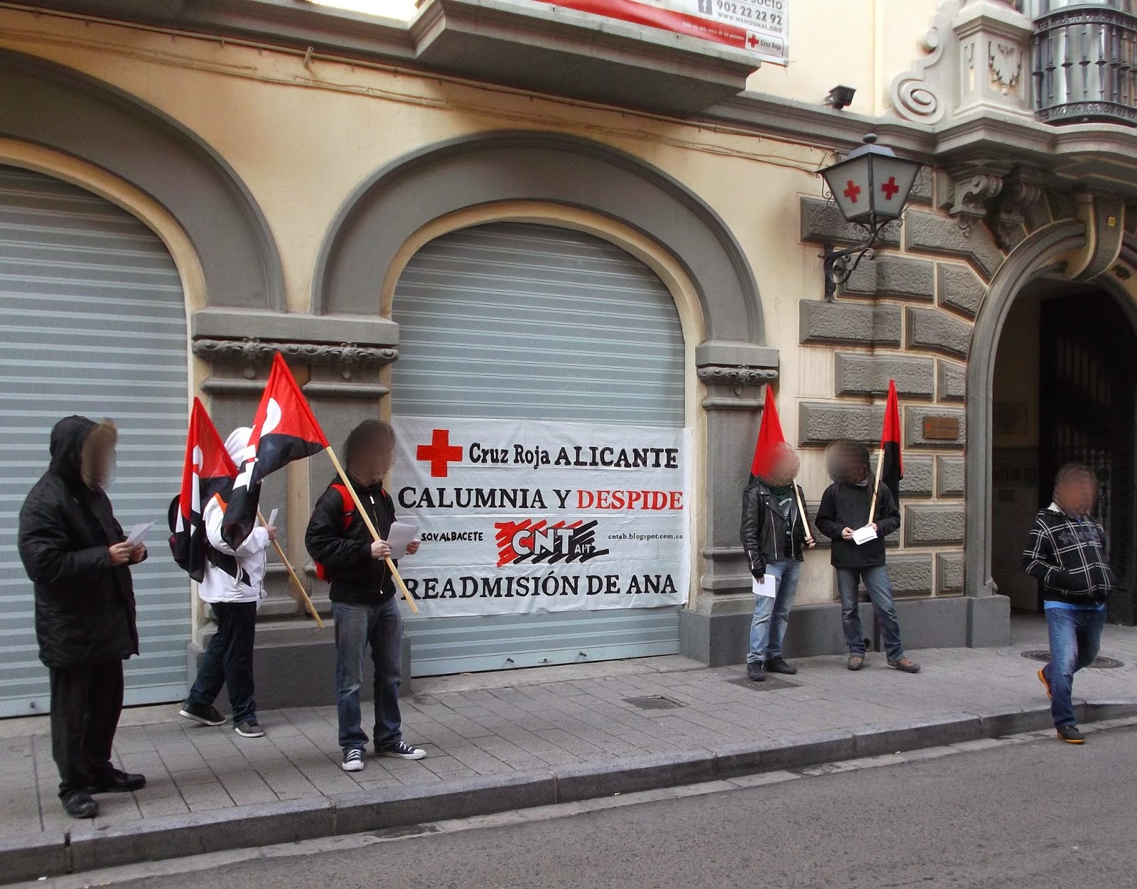 El conflicto, abierto desde CNT-AIT Alicante contra Cruz Roja, se debe a que una compañera que trabajaba como psicóloga en el Centro de Intervención de Baja Exigencia (CIBE) de Alicante (que da apoyo a personas con drogodependencia y bajos recursos), fue despedida de su puesto de trabajo en 2014.