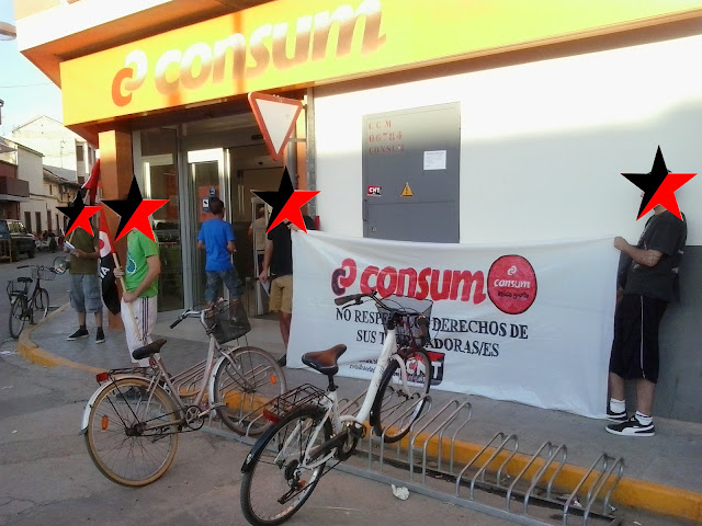 Desde el Sindicato de Oficios Varios de Albacete de la CNT-AIT seguimos defendiendo a nuestra compañera, por lo que como respuesta al despido iniciamos una campaña pública con fuerzas redobladas contra Consum. En Albacete capital ya han sido tres los piquetes que hemos organizado contra la empresa, uno más en Benissa y otro en la tienda que tiene Consum en el pueblo de Madrigueras, en la provincia de Albacete. Durante el piquete que se realizó en Madrigueras se repartieron más de doscientos panfletos, conseguimos que muchos vecinos se informasen del conflicto y conociesen la manera de actuar que tiene esta empresa que se disfraza de cooperativa y de tienda “amable”, pero que sólo es una empresa más, si cabe más venenosa que las otras porque usa el concepto de cooperativa para robar a sus trabajadores su dinero y sus derechos. En Albacete no quedará tienda de Consum que no sufra la acción directa de nuestro sindicato.