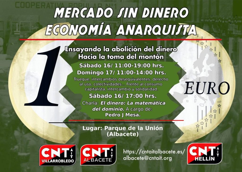 Con el fin de seguir rompiendo cultural y económicamente tanto con la superstición de que el dinero es necesario en las sociedades avanzadas, como con la creencia de que los intercambios deben ser equivalentes e individuales desde la CNT-AIT Albacete, volvemos a desarrollar este pequeño ensayo económico que es el Mercado Sin Dinero, un foro de economía anarquista práctica, esta vez centrándonos mucho más en la idea de “la Toma del Montón” ya que en el primer mercado la tendencia natural de las y los participantes condujo gratamente a esta fórmula colectiva fundamental.