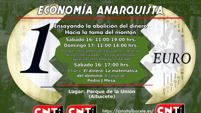 Volvemos este otoño con nuestro estacional ensayo de economía Anarquista, el “IV Mercado Sin Dinero, hacia la Toma del Montón”, que realizaremos los próximos 16 y 17 de noviembre en el parque de la Unión en Albacete. Además de la activada habitual contaremos el sábado por la tarde con una charla muy interesante sobre el Dinero: origen, historia, mitos e injusticias.