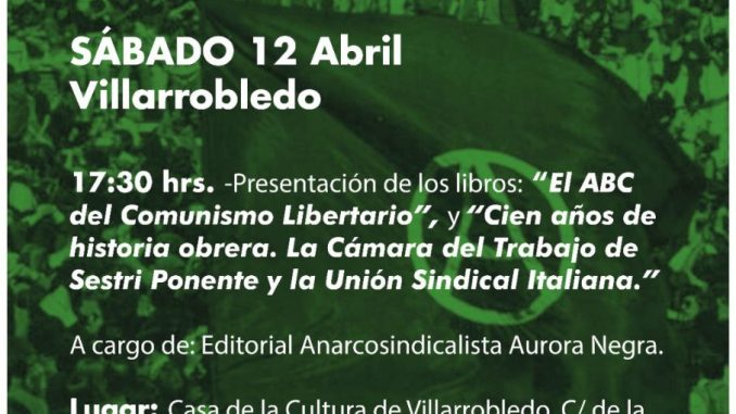 A pesar de un cambio de última hora, finalmente la Jornada comenzará a las 17:30 hrs. en la Casa de la Cultura de Villarrobledo, C/ de la Carrasca, N° 24, y se inaugurará con la presentación de los dos últimos libros publicados por la Editorial Anarcosindicalista Aurora Negra, «El ABC del Comunismo Libertario», y «Cien años de historia obrera. La Cámara del Trabajo de Sestri Ponente y la Unión Sindical Italiana».