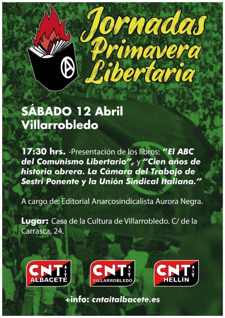 Desde el Sindicato de Oficios Varios de Albacete de la CNT-AIT, CNT-AIT Villarrobledo y CNT-AIT Hellín queremos informar del inicio e inauguración de nuestras Jornadas Primavera Libertaria que se celebrarán a partir del próximo sábado 12 de Abril en Villarrobledo, Albacete y Hellín.