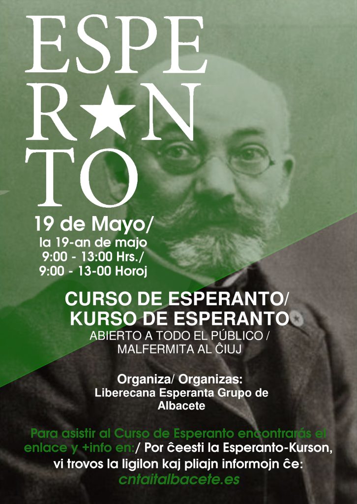 Desde el Grupo Esperantista Libertario de Albacete queremos informar que el próximo día 19 de Mayo se va a realizar el III Curso de Esperanto, organizado por el grupo en la provincia de Albacete. A diferencia de los anteriores Cursos que se realizaron presencialmente, la asistencia a éste será online, para facilitar la asistencia de aquellas personas que tengan dificultades para el desplazamiento.