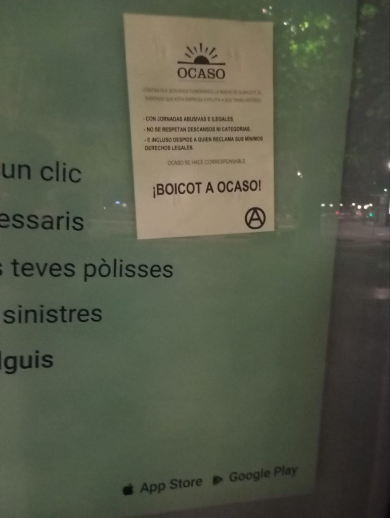 Desde el Sindicato de Oficios Varios de Albacete de la CNT-AIT queremos informar de una serie de acciones que se han realizado en Tarragona en solidaridad con el conflicto sindical que mantiene abierto nuestro sindicato por la readmisión de un compañero despedido en la empresa Servicios Funerarios La Nueva de Albacete, campaña que se ha hecho extensiva contra Seguros Ocaso, una de las empresas que contratan los servicios funerarios para sus asegurados por decesos.
