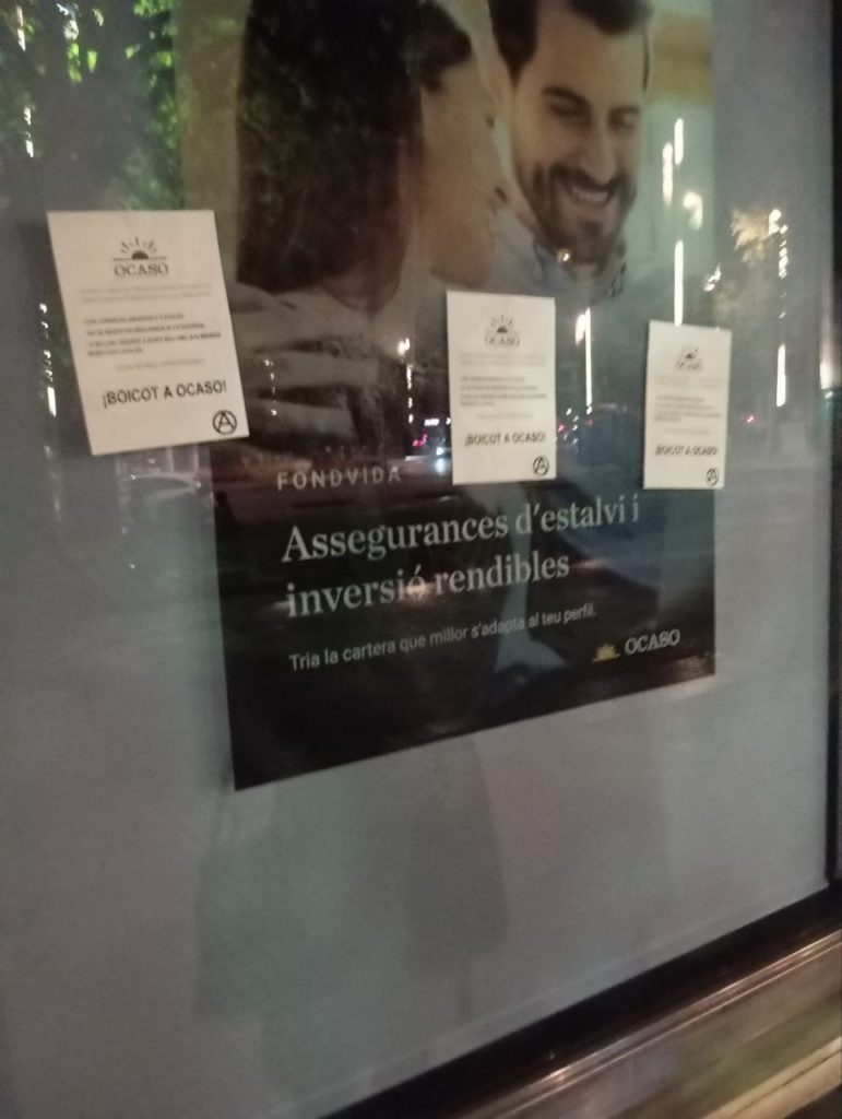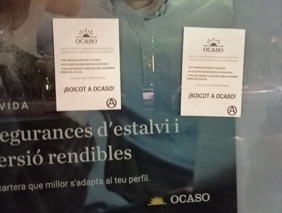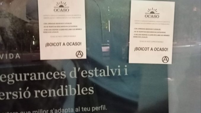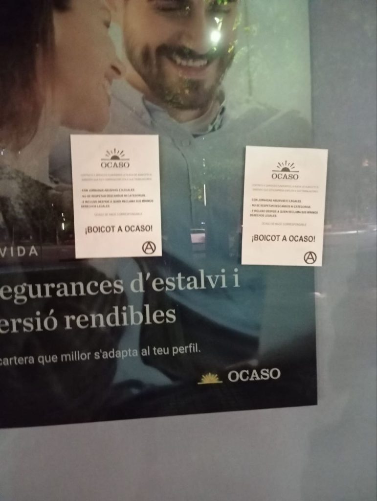 Las acciones que se han realizando en Tarragona en solidaridad con el conflicto sindical, nos han llegado a través de algunos militantes a los que les han informado de las acciones que se han realizado en una de las Oficinas de la empresa Seguros Ocaso en Tarragona. Con esta esperamos que se difunda el conflicto sindical contra esta empresa y se de difusión de las luchas de los trabajadores contra empresas explotadoras.