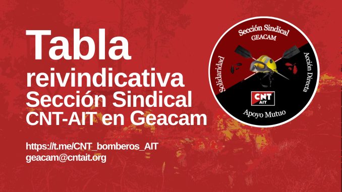 Desde la Sección Sindical de CNT-AIT en Geacam Bomberos Forestales de Castilla-La Mancha queremos informar que, del resultado de las diferentes asambleas que se han celebrado, hemos elaborado una Tabla Reivindicativa para dar a conocer el posicionamiento de nuestro sindicato en algunas cuestiones que nos afectan.