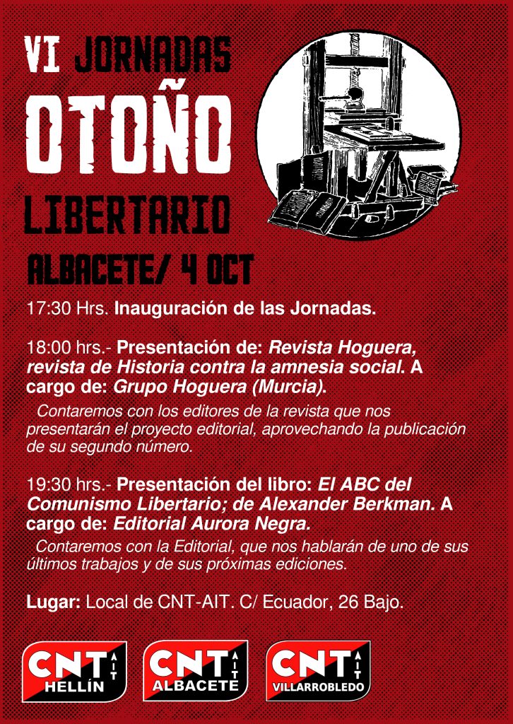 Las actividades comenzarán el próximo día 4 de octubre a las 17:30 hrs. en Albacete, en el local de la CNT-AIT, se inaugurarán las Jornadas de Otoño Libertario. Al mismo tiempo se dará comienzo a las 18:00 hrs. con la presentación de dos proyectos editoriales.