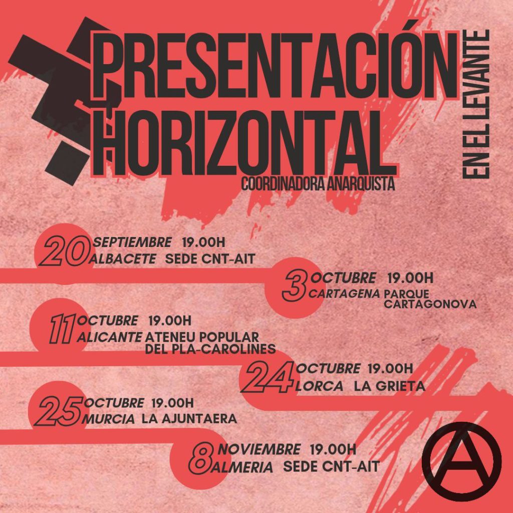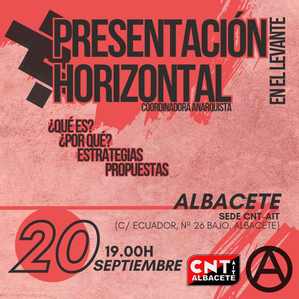 Desde el Sindicato de Oficios Varios de Albacete de la CNT-AIT queremos informar de la actividad que organizamos conjuntamente con la Coordinadora Anarquista Horizontal el próximo sábado día 20 de septiembre a las 19:00 hrs. en nuestro local en Albacete.