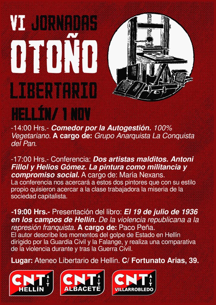 Desde el Sindicato de Oficios Varios de Albacete de la CNT-AIT y desde CNT-AIT Hellín queremos informar que el próximo sábado día 1 de noviembre contaremos en nuestro local, en el Ateneo Libertario de Hellín, con la tercera jornada del Otoño Libertario, organizado por nuestro sindicato.
