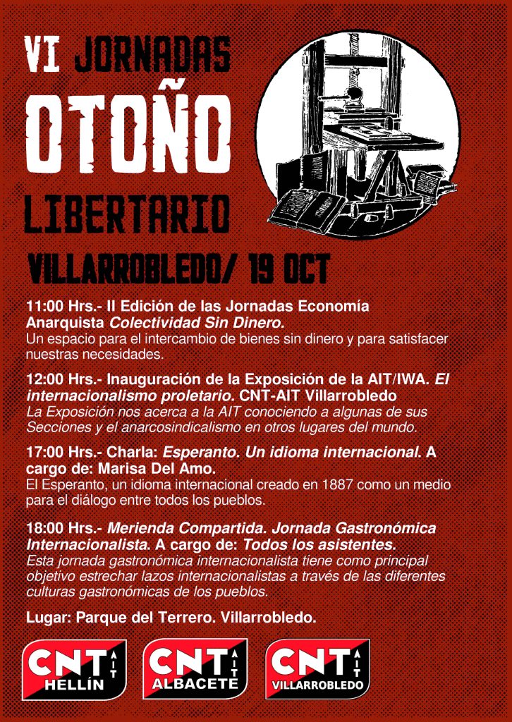 El próximo domingo 19 de octubre el Núcleo de Villarrobledo de la CNT-AIT organiza una Jornada Internacionalista y de Solidaridad Obrera en esta localidad. La jornada contará con múltiples actividades, como nuestra habitual Colectividad Sin Dinero (antiguo mercado sin dinero), una degustación gastronómica internacional con la aportación de platos típicos de distintos pueblos internacionales presentes en Villarrobledo, una exposición sobre la Asociación Internacional de los Trabajadores AIT o una charla sobre el Esperanto idioma internacional.