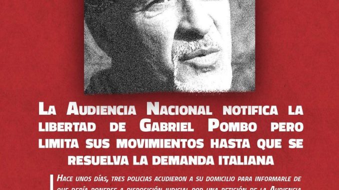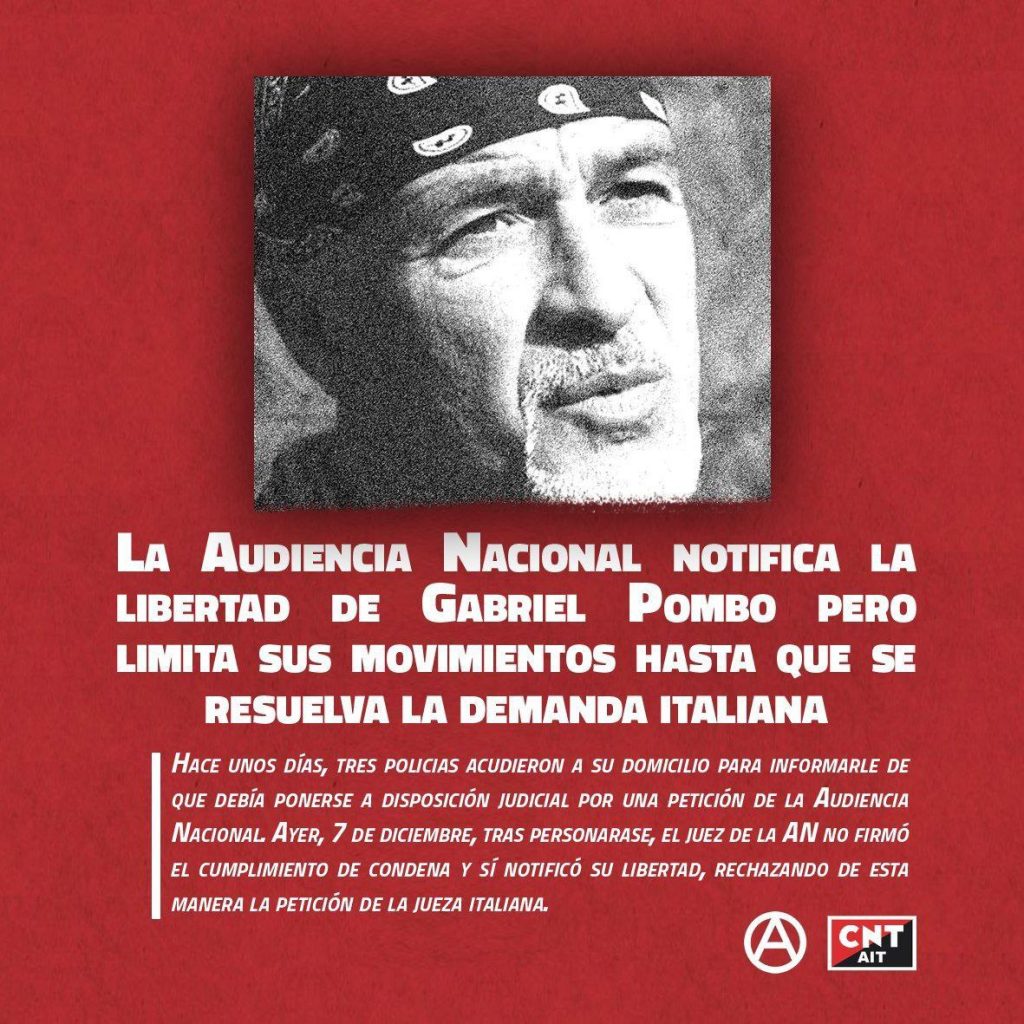 Desde el comité Pro Presxs y desde toda la CNT AIT expresamos nuestra alegría por la noticia y estaremos vigilantes para evitar que nuestro compañero Gabriel Pombo sea objeto de nuevas represalias por parte del Estado italiano o cualquier otra instancia de poder.
