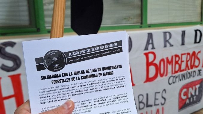 Esperamos que la empresa tome nota que los bomberos forestales de la Comunidad de Madrid tienen apoyo de muchos compañeros y compañeras en muchas regiones, y que desde la Sección Sindical de CNT-AIT en Geacam apoyamos la lucha de las trabajadoras y trabajadores de nuestro oficio que luchan por mejorar sus condiciones de trabajo.