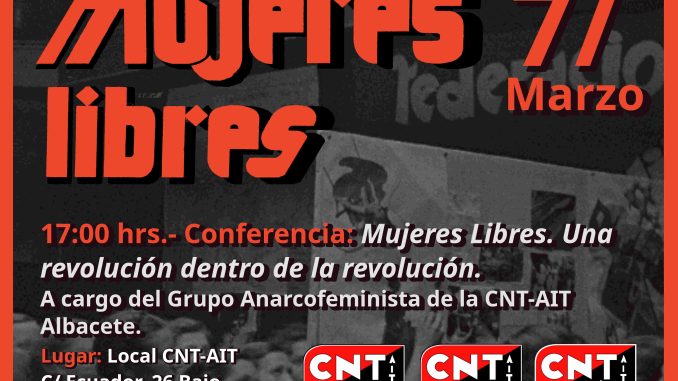 Desde el Grupo Anarcofemista de CNT -AIT Albacete os invitamos a participar en la charla-coloquio organizada para el próximo 7 de Marzo a las 17:00 hrs. en el local de la CNT-AIT de Albacete, sobre la organización y la Editorial Mujeres Libres.